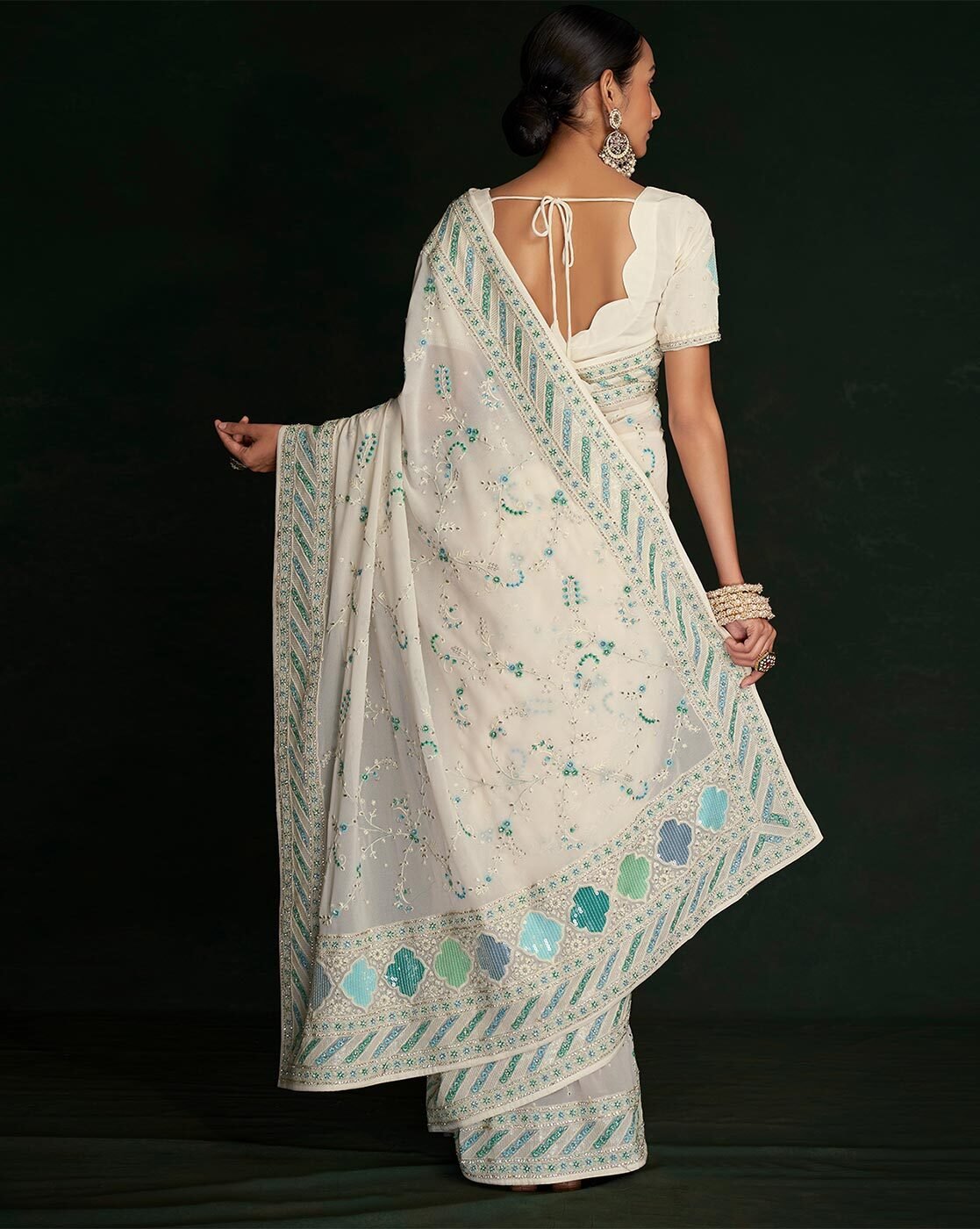 - The last image gives a detailed look of the blouse piece that comes with this saree (The model is wearing a blouse from our in-house wardrobe)